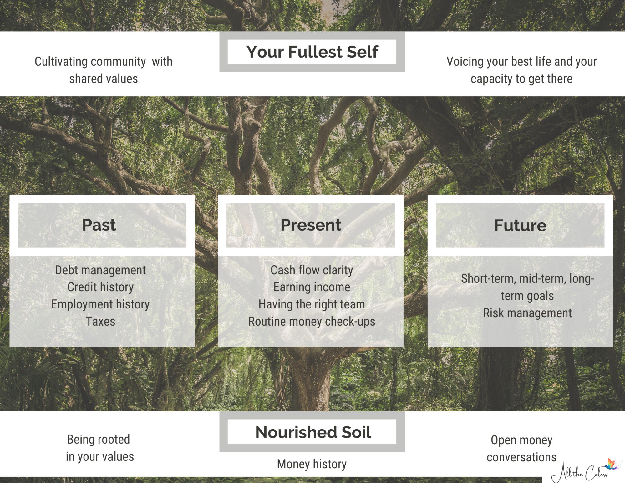 - Are you unsure of how to align your values with your money?All the Colors provides the education needed to make financial decisions, accountability to take action, and coaching to understand why we do what we do with money.