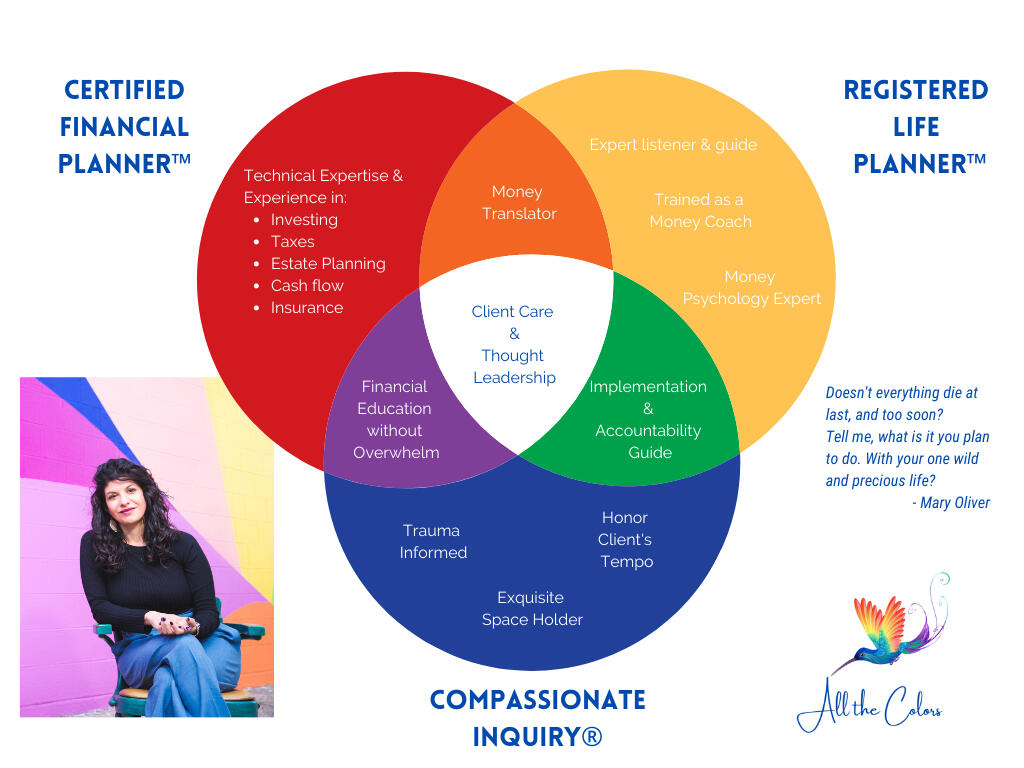 I earned the CERTIFIED FINANCIAL PLANNER™ Practitioner designation in 2020 and went through the Registered Life Planner™ training in 2021 from the Kinder Life Institute. In 2023 I completed Gabor Maté’s Compassionate Inquiry™ training to enhance my facilitation skills in a trauma informed way.See the image below to understand how these three expertise come together.Before finding my calling as a financial planner and coach, I worked in social services, population projections, and business analysis at a manufacturing company.